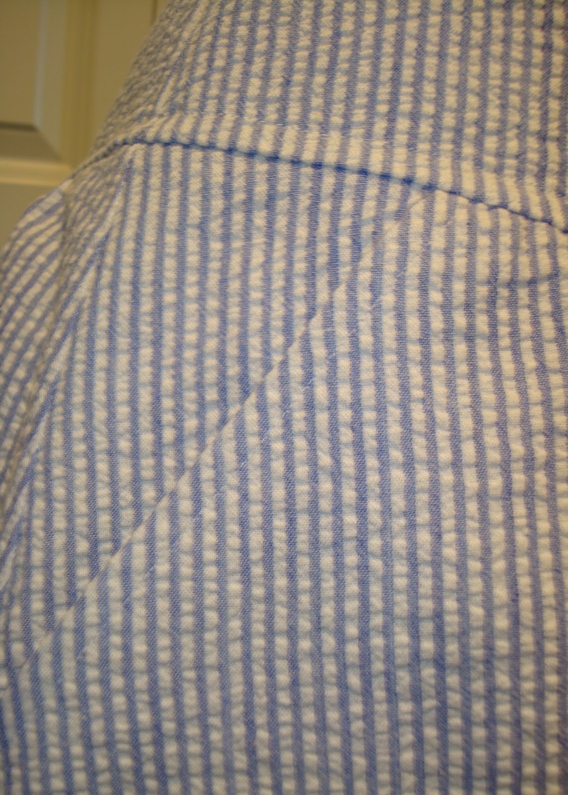 - This was my seersucker gateway make and one of the first things I used my serger on. I loved using the rolled hem on the front ruffles and sleeves. I was really not looking forward to sewing a teeny, tiny hem on those bias cut ruffles. The skirt seemed roomy enough so I omitted the side slit and can still walk normally. Looking at this photo I wonder if I should shorten the skirt just a smidge.